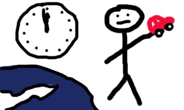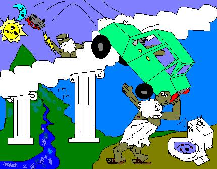 Quizro's caption for above drawing: "I straddle the Earth like a Titan, hurling automobiles at the clock of the Moon."