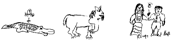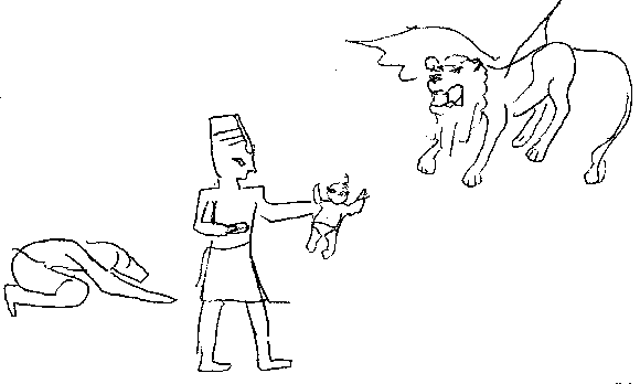 | Scott | "Preparing for the sacrifice, the High Priest prepares to throw the small child into the mouth of the manticore, while the crocodile man lies prostrate before the affair." |