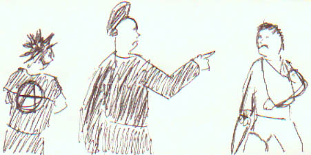 | "The Anarchist looked on as the mohawked person gave the man with the broken arm and the umbrella the finger waving of his life." | |