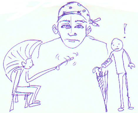 | "As the mohawked boy shook a golf club, I noticed my umbrella would be no protection. I had a broken arm, the pirate watched." |