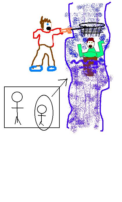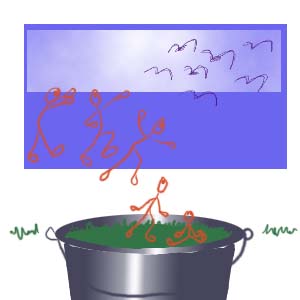 "a man tries frantically to save with a net his poor midget-friend drowning in a bucket at the bottom of a river."