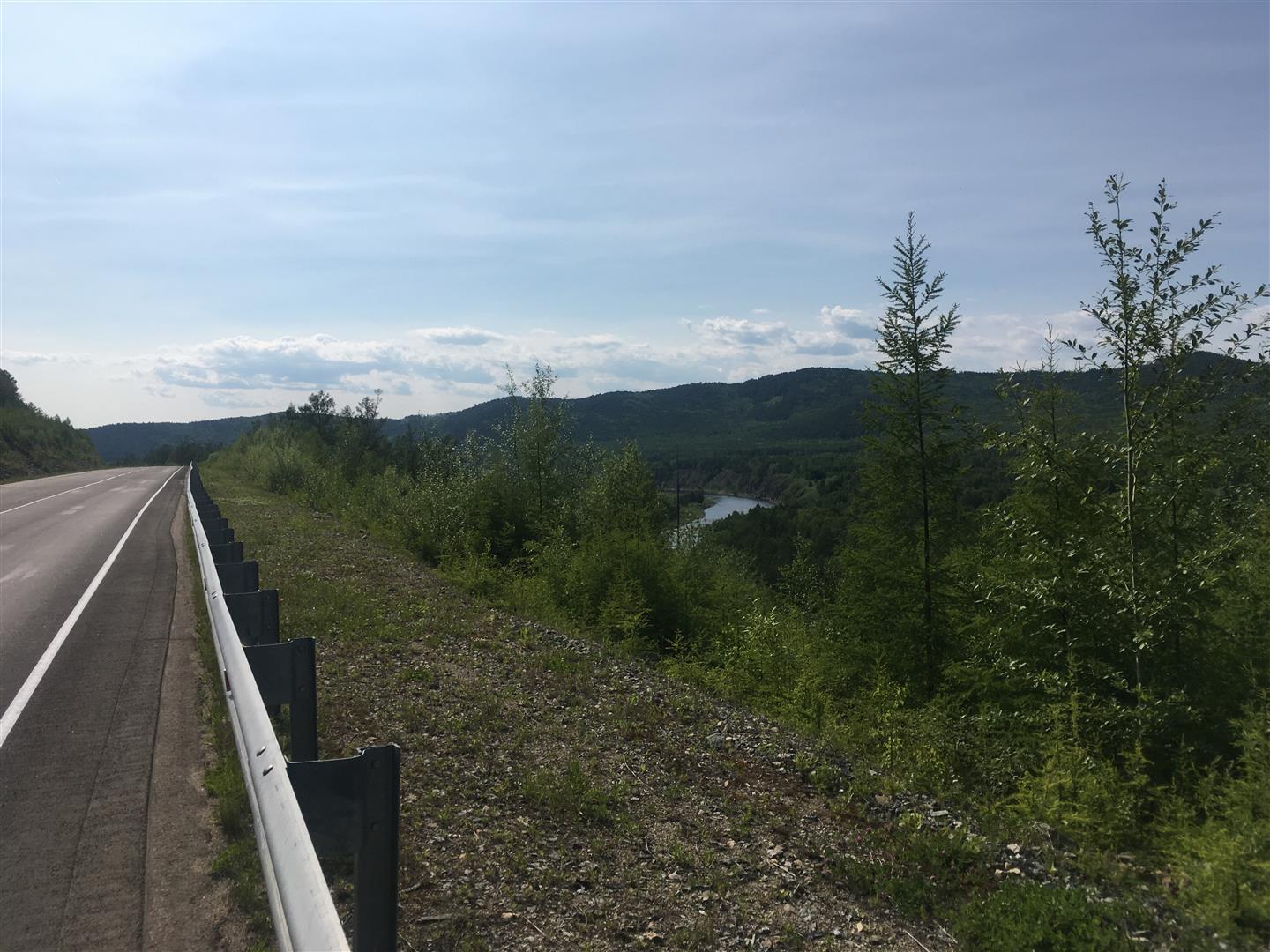 The road went up and down over increasingly large hills; from one creek and watershed to the next; occasionally descending some distance to cross some now-significant rivers. Yerofey Pavlovich seemed to be on one of these, so I figured the day would end with a nice long downhill into the hotel.