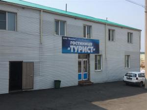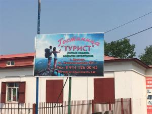 Instead I shone my bike headlight around, and saw a billboard for the one that was supposed to be right there. The hotel "Tourist." The billboard looked friendly enough. It showed a couple of backpackers -- generally my kind of people! There was an arrow pointing left, off the road. I walked the bike down to the left, and indeed, there it was: the Hotel "Tourist."