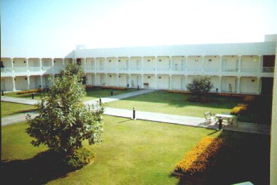 | This is the same shot, taken from ground level (my room window). The gardens look nicer than they really are (especially during the middle of the day when it's blazing HOT out and they offer scant shade...) In the midground you can see the Stupid Fence (TM) that encloses the dorm areas and only has one exit and I have to walk an extra quarter mile each way to get to, when I'm late for classes and it's hot out and... sorry. I'm ranting again. |