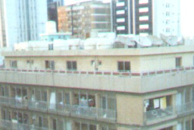 | Another older building. This pic taken from my parents' balcony. Here I draw your attention to the roof. On the right are a large cluster of satellite dishes. Just barely visible in this picture you will notice a bunch of little black lines superimposed over the top floor of the building. Now those would be many dozens of cables leading from those satellite dishes to each and every window in the building so that their tenants can watch Baywatch Hawaii, V.I.P. and the various movie channels which actually feature the occasional bare female breast (something quite unheard of 10 years ago, I assure you)! There are all sorts of cultural ramifications of this that are quite beyond the scope of this page. Sex and the city, indeed! |
