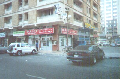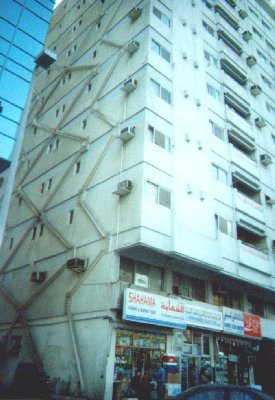 | This is the same building as the last picture, but from a different angle. The building is probably no more than 10 or 15 years old; those struts were a later addition. Their cause is a complete lack of building codes as we know them. Plus an incredible construction boom (Abu Dhabi was all palm frond shacks and dirt roads as recently as 1973), plus owners willing to exert that old wasta thing to cut corners and you have an "instant city" (pop: 850,000, up from 5,000, no tyops there) that is falling apart 10 years later. At the upper left corner, you can see its neighbour, an elegant and sleek glass office tower that is typical of most newer buildings. One wonders how long it will last. On the surface, things look like they are changing but it's hard to tell how much of that is real and how much illusion. I'd say that almost half the buildings in the city (again, dating mostly from the early 1980s onwards) have been razed and rebuilt at least once. |