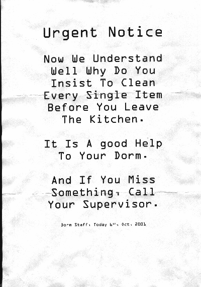 | Signs like are posted up all over the dorm. This particular specimen was discovered in the kitchen a short while back. They are all printed in the same pseudo-1970s-teletype font and all prefixed with "Urgent Notice." I prefer to call them "Incomprehensible Notice." This one was good for wasting time while my food was cooking trying to figure out exactly what the author was trying so urgently to get across. For some unknown reason the "good" in "It Is A good Help To Your Dorm." is the only word in the entire urgent notice that is not capitalized. Luckily, "dorm staff" speaks better Engrish than he writes. |