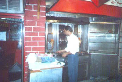 | Ah, the happy smilin' shwarma man! For those of you unfamiliar with the beast, a shwarma is similar to a donair (except it hails from Lebanon rather than Greece). They are sold at roadside stands like this all over the Middle East for about 70 cents (probably considerably less in poorer countries). Delicious as all hell. This guy is across the street from my parents' place and knows my preferences by heart (no pickles, extra garlic). He's always super happy to see people (especially if they might be customers) and has a perpetual smile (unfortunately invisible in this picture). Hence, the "happy smilin' shwarma man." |