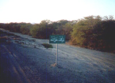 | Speaking of road signs, this species is especially common in this country. They are little signs littering all the major roads at every 2 or 3 km, with religious ephithets and Qur'anic excerpts on them. This specific example encourages the reader to "put your trust in Allah." Most contain similar messages. I think it goes without saying that there is no separation of state and religion here. |